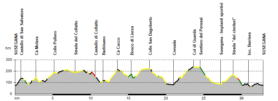 Le colline di Susegana e del Collalto, con le roccaforti medievali e le sconfinate distese di vigne, rappresentano una delle zone più incantevoli e suggestive della Marca Trevigiana: sarà quindi un piacere pedalare attraverso questo territorio, tra sterrati e saliscendi mai impegnativi. Da segnalare l'attraversamento di alcune proprietà private dove il transito è solitamente tollerato.
