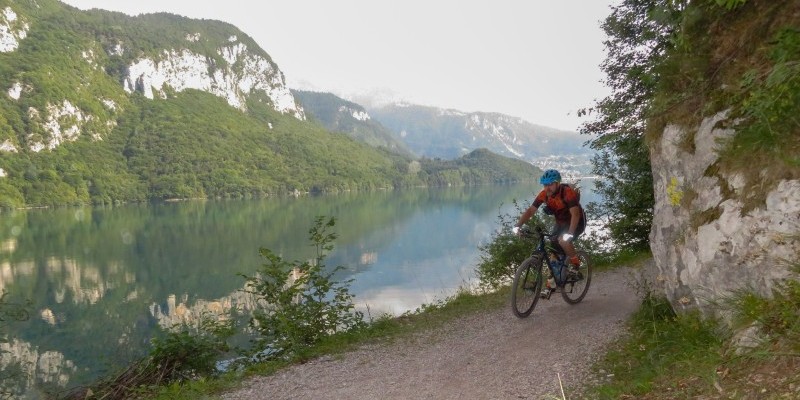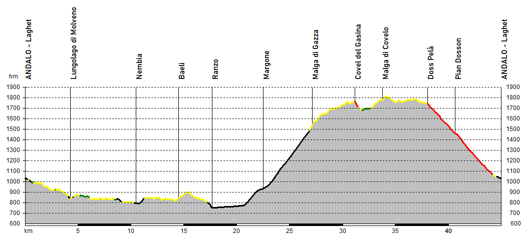 I primi venti chilometri sono piuttosto agevoli e prevedono poco più di 250 metri di dislivello: si parte infatti da Andalo scendendo al lago di Molveno per la valle del Rio Lambin, seguendo poi i saliscendi a pelo d’acqua verso Nembia e affrontando la breve rampa di Pozol.
