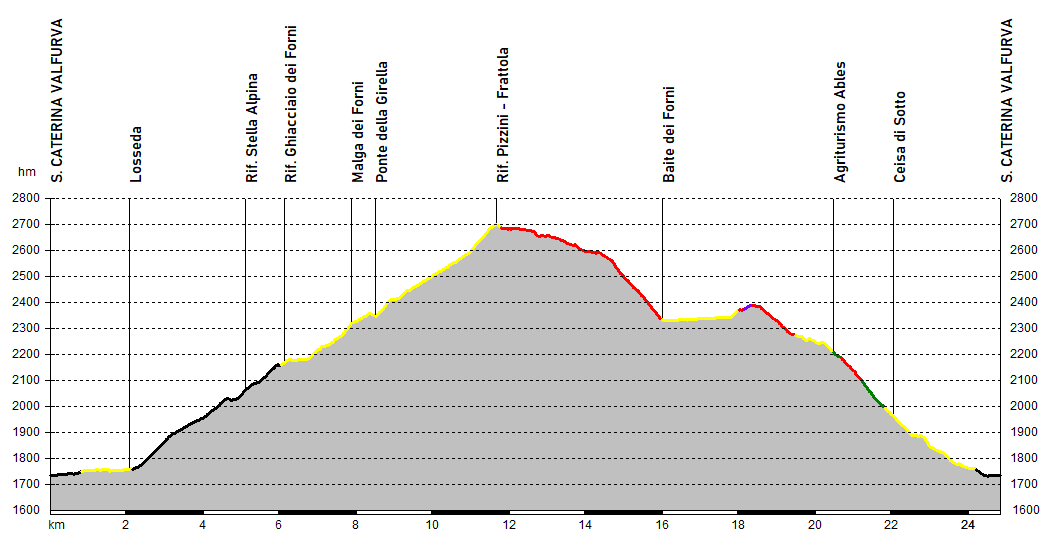 Da Santa Caterina Valfurva si risale la valle dei Forni fino al rifugio omonimo, pedalando su asfalto dalle pendenze a doppia cifra: da qui si prosegue su sterrato più agevole, addentrandosi nella valle e scorgendo in lontananza le prime lingue di ghiaccio.