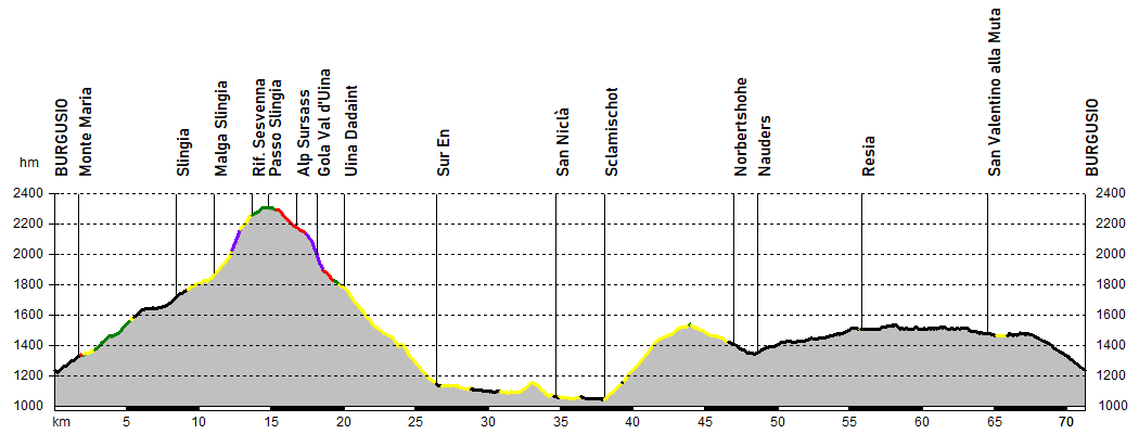 La salita iniziale misura oltre mille metri di dislivello e con la prima metà si arriva a Slingia, idilliaco villaggio alpino nel cuore della valle omonima, raggiunto prima con il piacevole Sentiero delle Ore e poi sulla più comoda rotabile asfaltata.