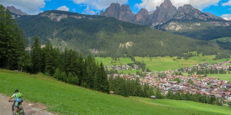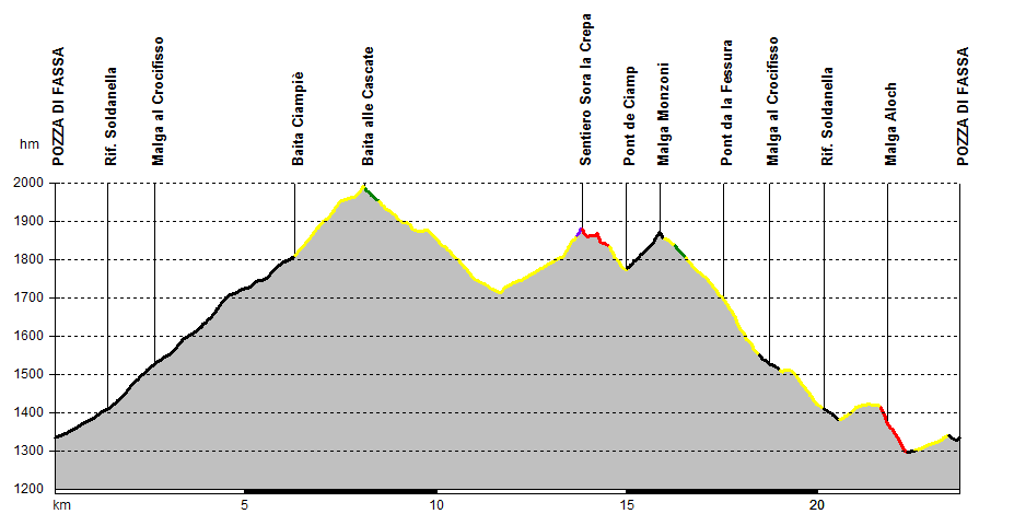 La prima salita segue la strada asfaltata che da Pozza di Fassa conduce