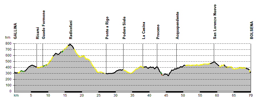 La tappa inizia come era finita quella precedente, ossia con il meraviglioso contesto della val d’Orcia a far da sfondo al percorso, che dopo una prima parte ondulata va ad affrontare l’impegnativa ascesa di Radicofani.