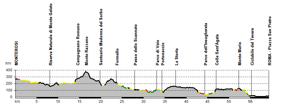 L’ultima tappa della via Francigena, una delle più facili di tutto il tour, incontra le prime asperità dopo quindici chilometri con il duro strappo di Campagnano Romano e le rampe del monte Razzano.
