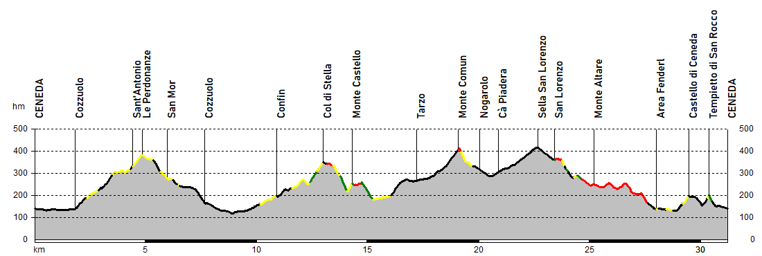 Da qui l'itinerario si impenna verso il Col di Stella, presentando rampe arcigne e un difficile tratto erboso poco prima dello scollinamento; la successiva discesa tra i vigneti porta invece al breve strappo del Monte Castello, che segna l’ingresso nel territorio di Tarzo.