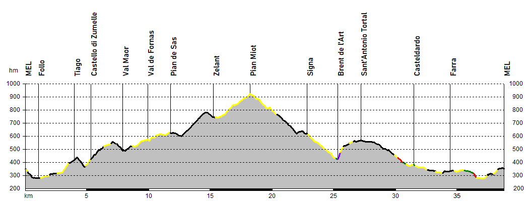 Si lascia il centro di Mel scendendo sulla suggestiva discesa della Carrera, andando poi a intraprendere la lunga a discontinua salita che caratterizza il tour.: il primo strappo culmina alle case di Tiago mentre il secondo, su un largo tratturo pedonale, raggiunge le pendici dell’altura su cui sorge l’imponente castello di Zumelle.